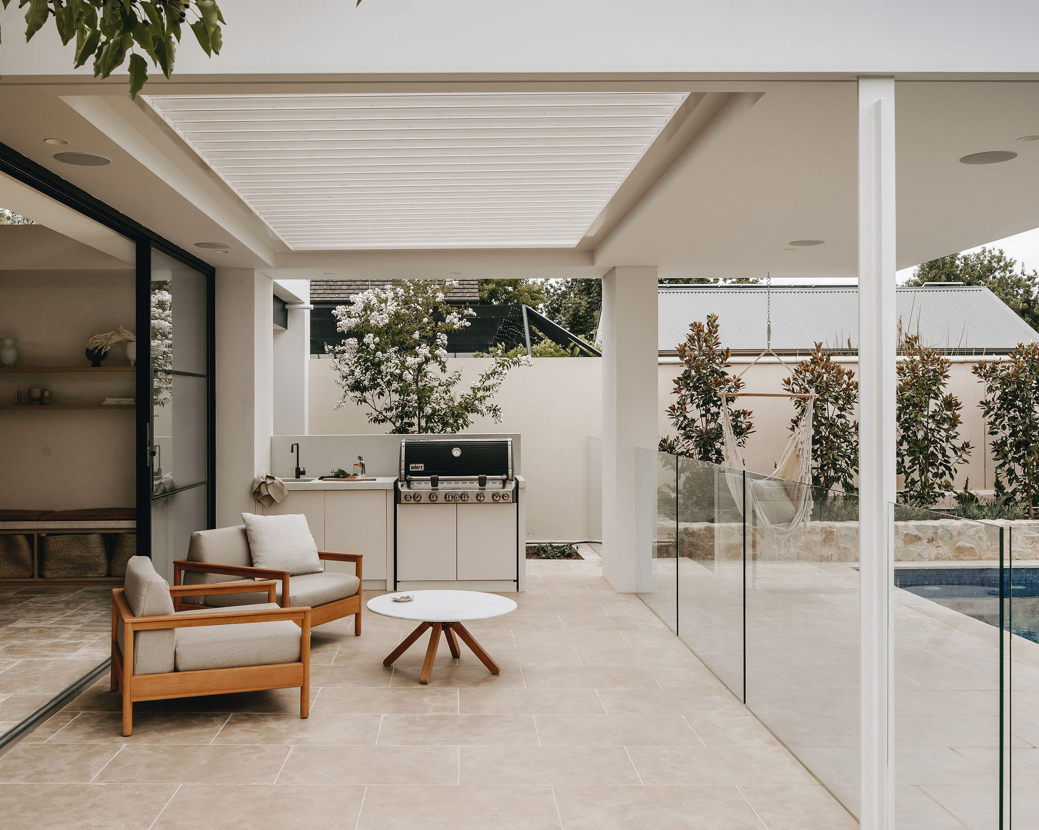 Designed as both a complement and counterbalance to the original heritage home, the Pavilion weaves and gently layers new forms and materials to create a welcoming area for family and friends. Sited at the rear of the property and separated from the main residence, the new pavilion offers freedom of form through a sweeping rammed earth wall, a twist on the solidity of the style of existing home.