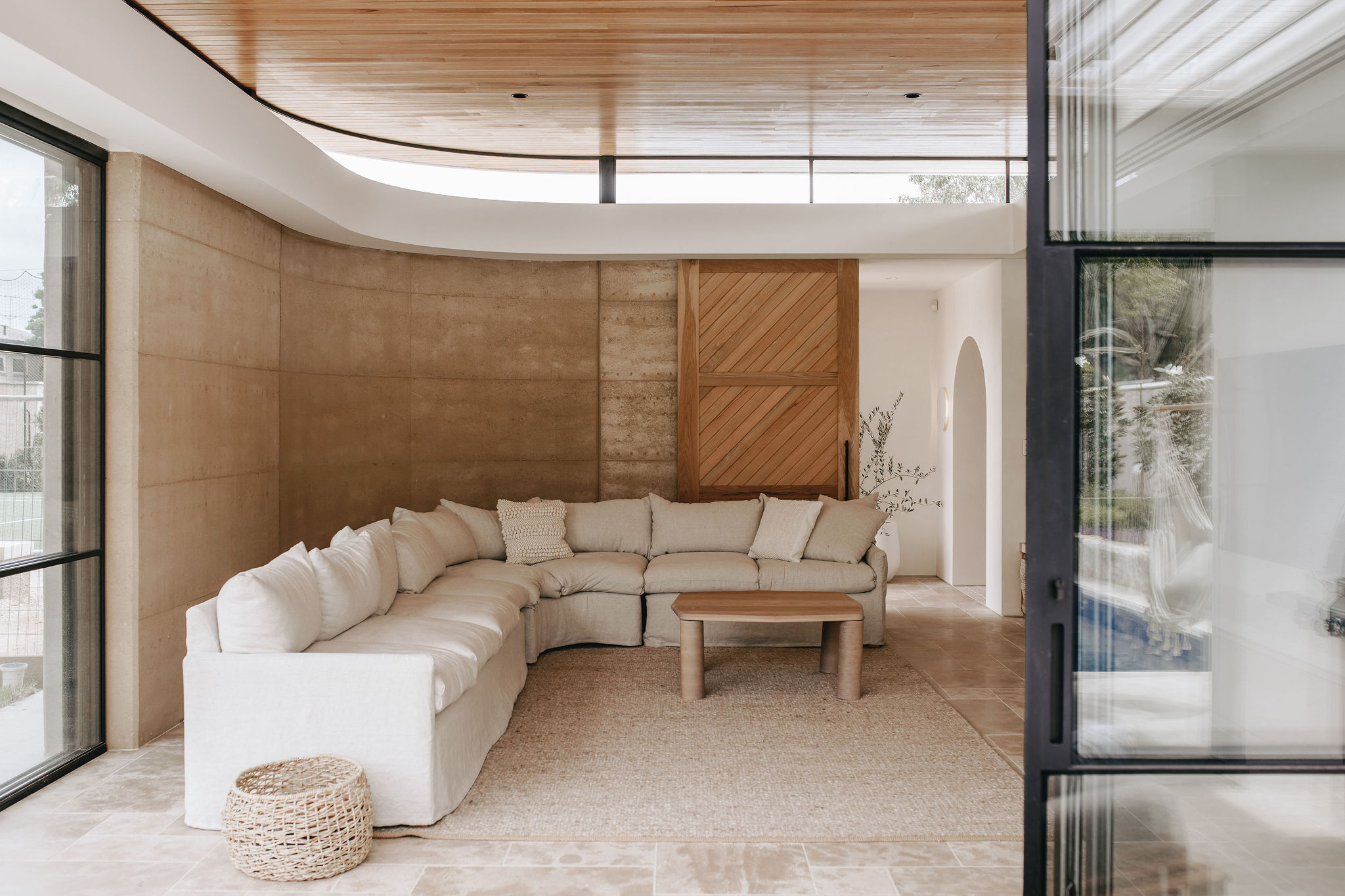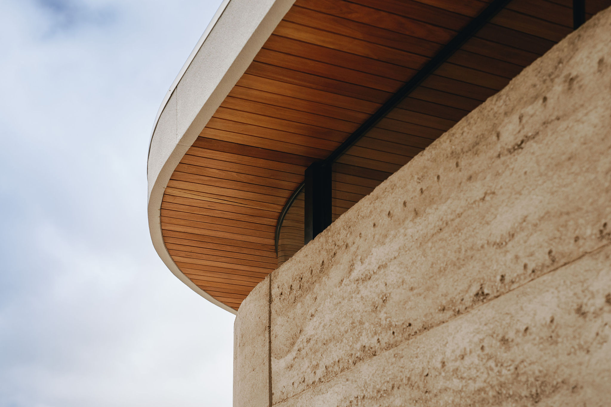 Anchored in landscape, spatial planning transitions from a warm and open living area with the ability to fully engage with the pool, across the scope of the building to more enclosed spaces beyond the forecourt. Darkened aluminium screening forms a respective element across the façade, facilitating a degree of privacy to the study and offering a material link to required garaging culminating in a gentle curve to shelter the dedicated recording and music studio.