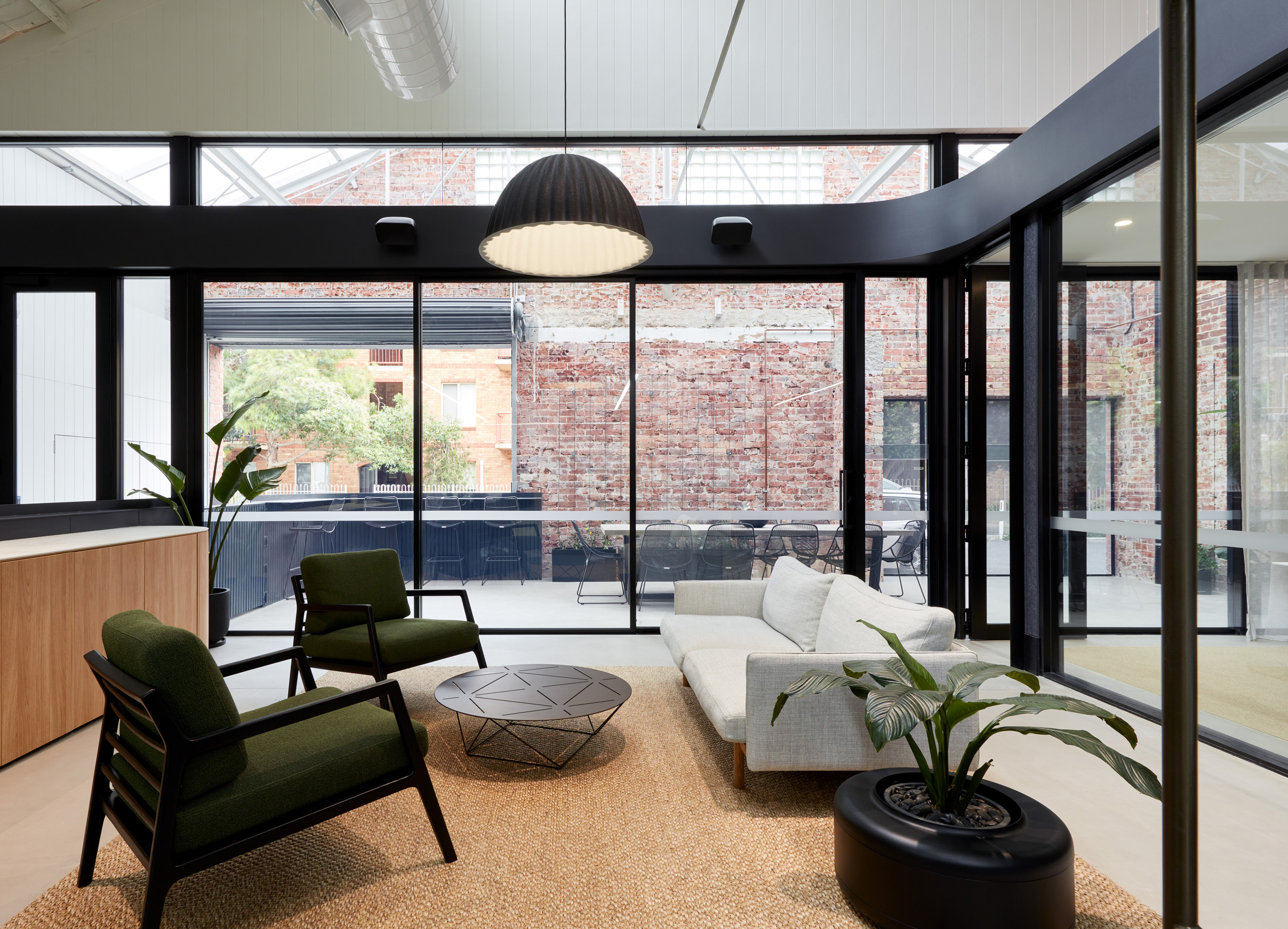 Repurposing an existing brick building, the fitout takes advantage of the frontage to create a private working area with communal break out spaces closest to the street.
