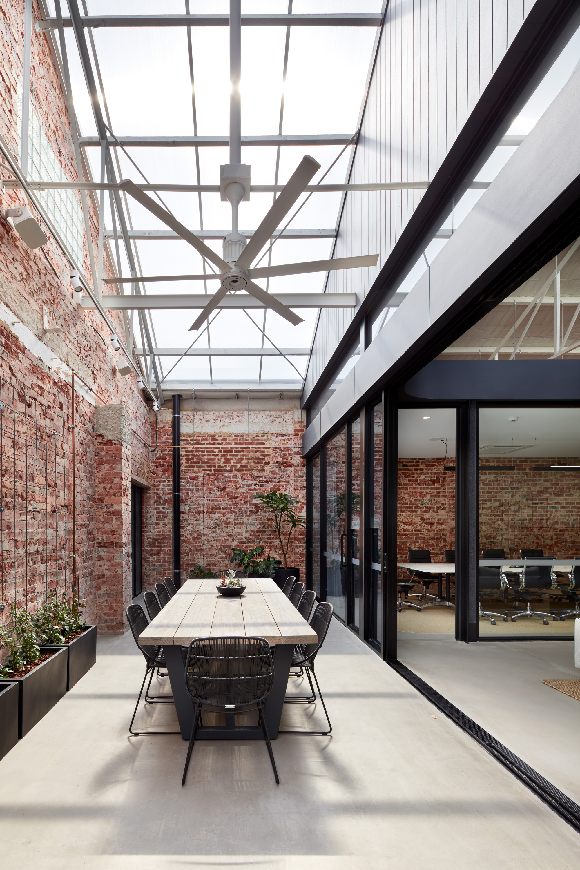Commencing from a basic shell, the blank canvas encouraged collaboration and integration to achieve a modern workspace. Translucent sheeting filters light into the terrace, exposing brickwork and celebrating existing building fabric, while utilising existing street front openings offers glimpses within and encourages interaction with the street-wide community.