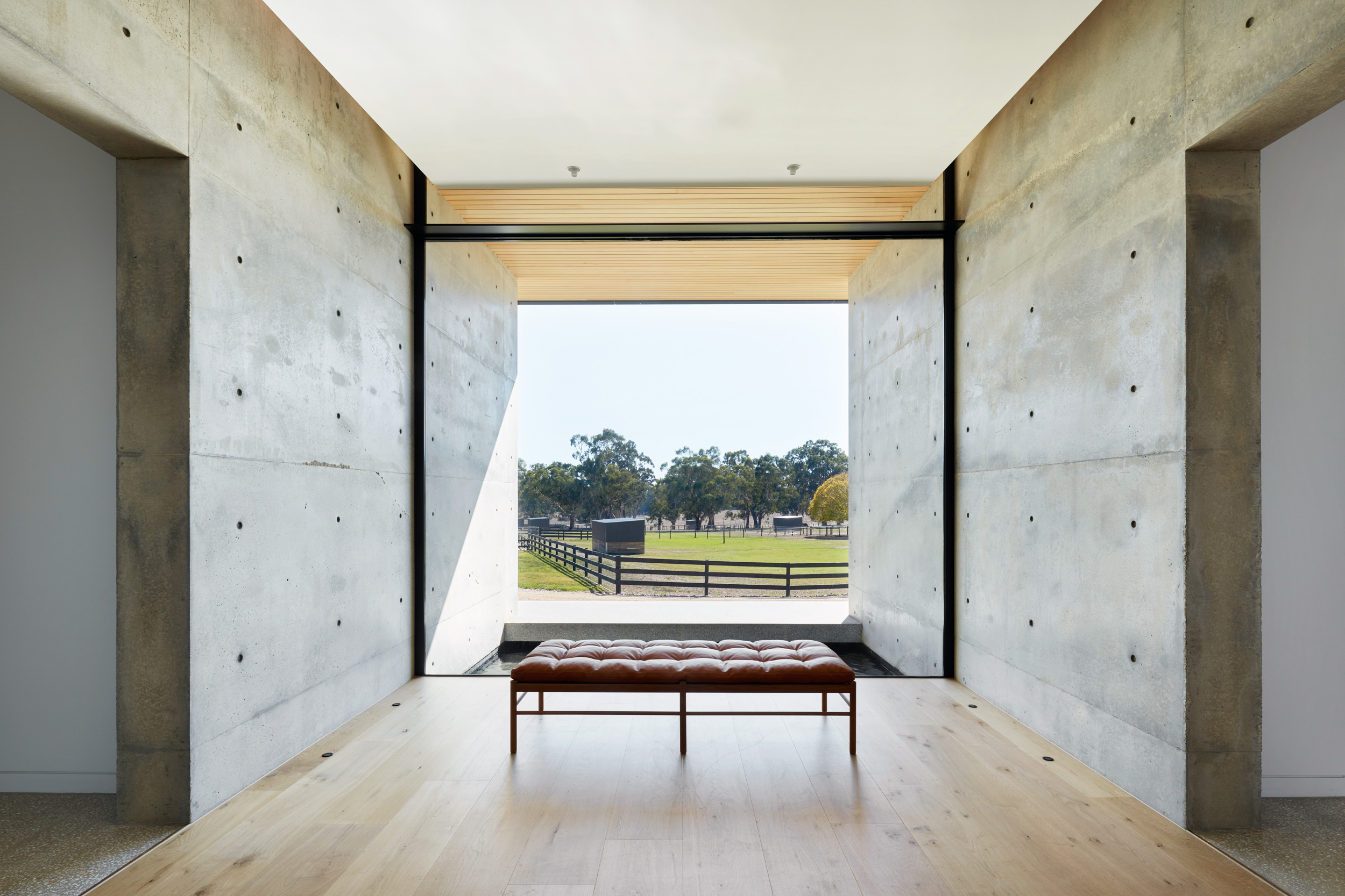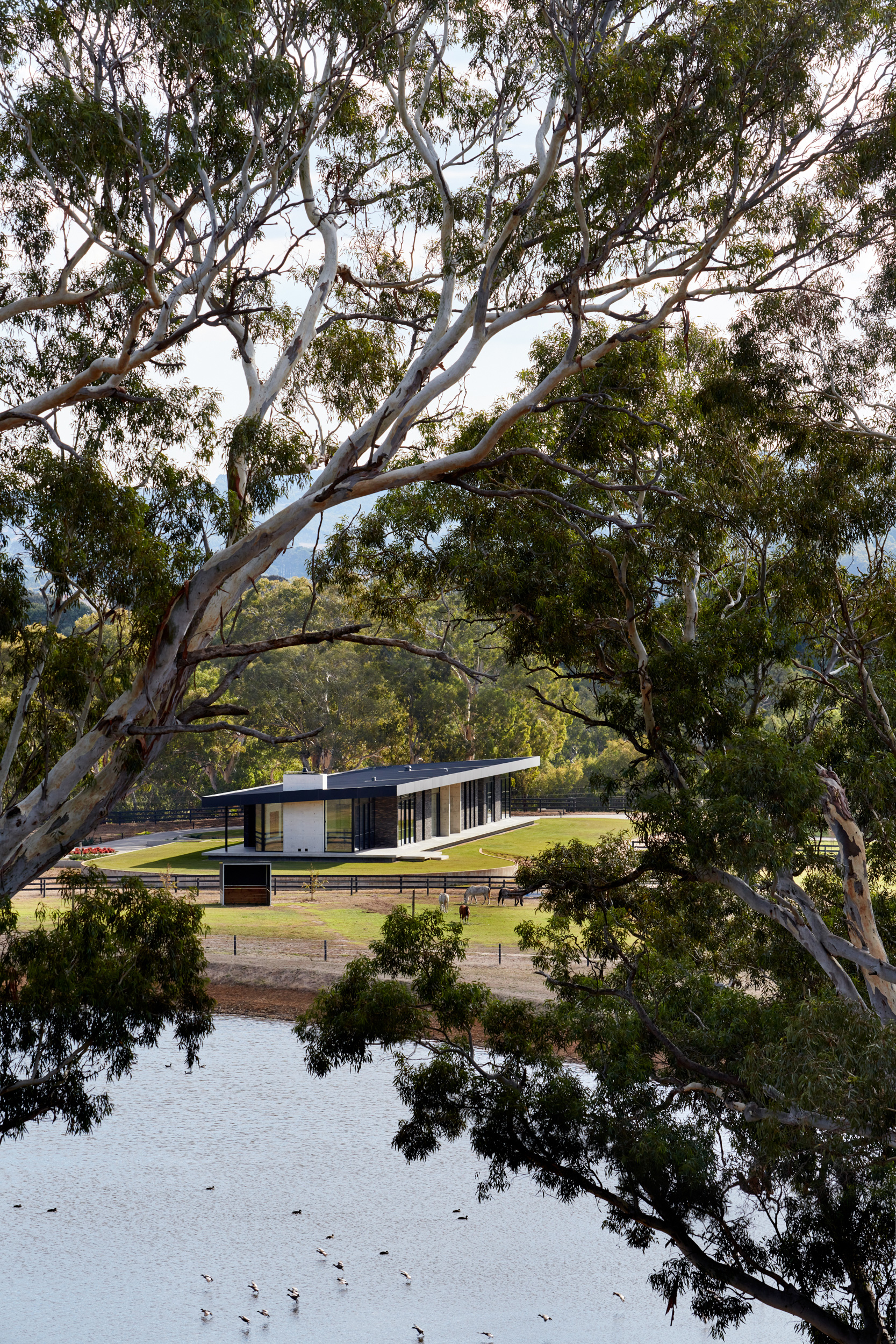 Sitting long and low in the landscape, Oakbank Pavlion celebrates without imposing on its locale. Using strong and crisp forms the pavilion utilises succinct planning to create an elongated extrusion celebrating a continuity of materials flowing from external to internal spaces.